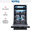 Полностью встроенная модель Кертинг KDI45575 предназначена для установки в кухонную мебель — шкаф, тумбу, нишу. Высота устройства составляет 81,5 см, но благодаря регулируемым ножкам ее можно увеличить до 87,5 см. Ширина 44,8 см и глубина 55 см — стандартные значения для узких посудомоек, так что встраивание не составит труда. Размеры ниши, куда будет установлен прибор, составляют 45 на 58 см. На дверцу навешивается декоративный фасад с жестким креплением в соответствии с общим стилем помещения. На торце двери находится закрытая электронная панель управления серебристого цвета с крупными кнопками и дисплеем белого цвета Cold White.