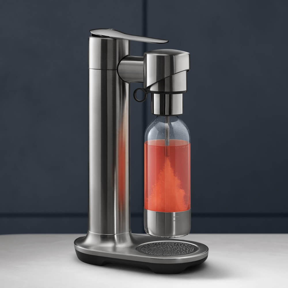 Принцип работы предельно прост: достаточно наполнить бутылку водой, установить её в держатель и нажать кнопку. Под давлением углекислого газа из сменного баллона жидкость насыщается пузырьками, превращаясь в освежающую газировку. Пользователь сам регулирует степень насыщения — от лёгкой игристости до насыщенного перлящего эффекта.