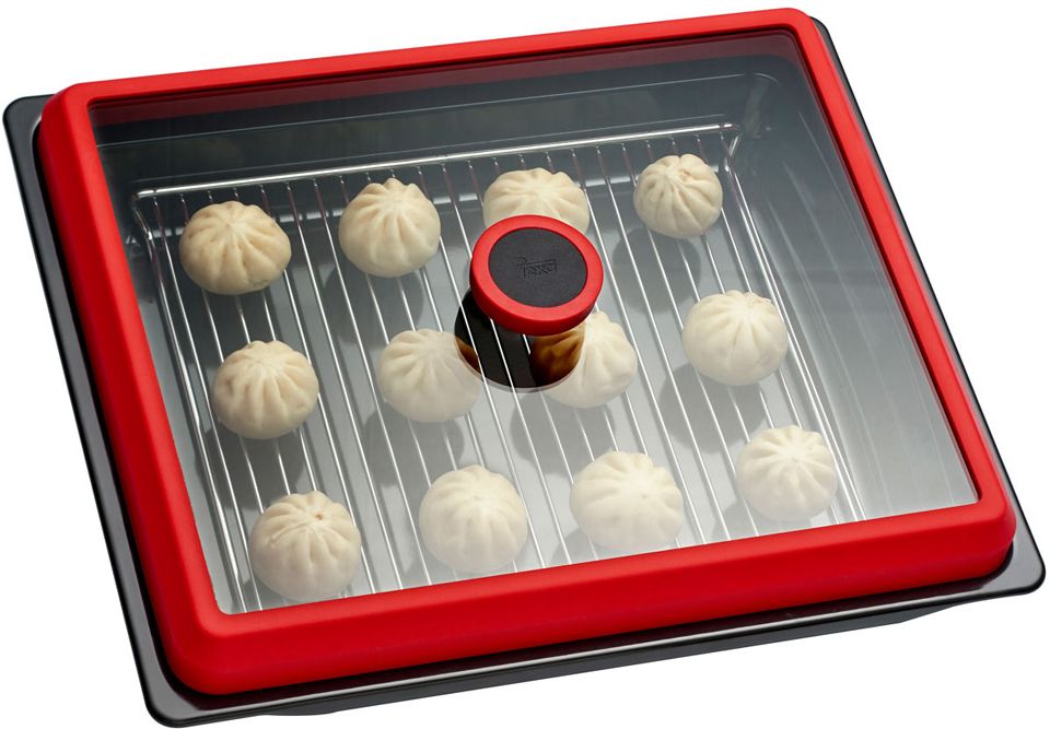 1 стеклянная крышка с силиконовыми уплотнителями и отверстием для вывода пара (позволяет готовить блюда на пару, если налить на дно основного противня воду)