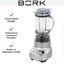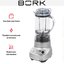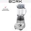 Блендер BORK B705 — стационарная модель высотой 44 см и весом всего 4 кг для размещения на столешнице. Корпус прибора изготовлен из металла серого цвета. Чаша для измельчения сделана из прочного и безопасного пластика: ее объем составляет 1,5 литра. В передней части корпуса находится электронная кнопочная панель управления с небольшим дисплеем. При помощи кнопок можно задать одну из 5 скоростей работы, установить таймер обратного отсчета, выбрать режим интенсивной обработки для колки льда и две программы для приготовления смузи. Блендер оснащен специальной программой очистки. Минимальная скорость вращения составляет 12000 об/мин, Высокая скорость, а также специальная конструкция ножей Kinetix из нержавеющей стали, позволяет справиться с измельчением любых продуктов. Двигатель прибора имеет защиту от перегрузок.