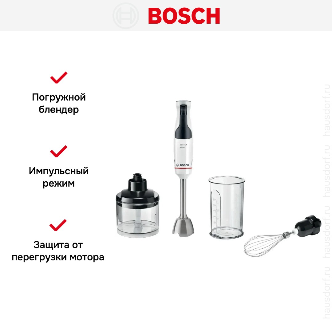 Погружной блендер Bosch позволяет готовить смузи, коктейли, смешивать соусы и заправки и многое другое. Такая конструкция требует вашего участия — нужно держать рукоятку с насадкой и контролировать направление движения. Плюс в том, что можно использовать ее прямо в кастрюле, когда готовите, например, суп-пюре. Корпус сделан в основном из пластика, что уменьшает вес прибора. Он может как влиться в общую гамму интерьера, так и стать ярким акцентом; доминирующий цвет — белый.