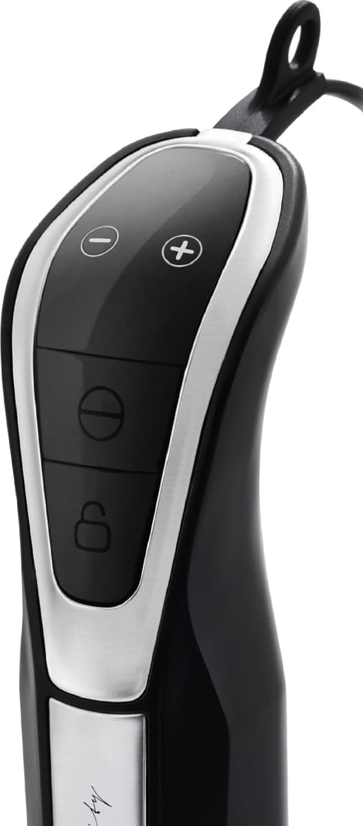 Погружной — мотор расположен в рукоятке, на конце которой есть насадка с венчиком или ножами. Вы опускаете ее в емкость и измельчаете продукты, удерживая прибор на месте, нажимая или проводя по кругу.