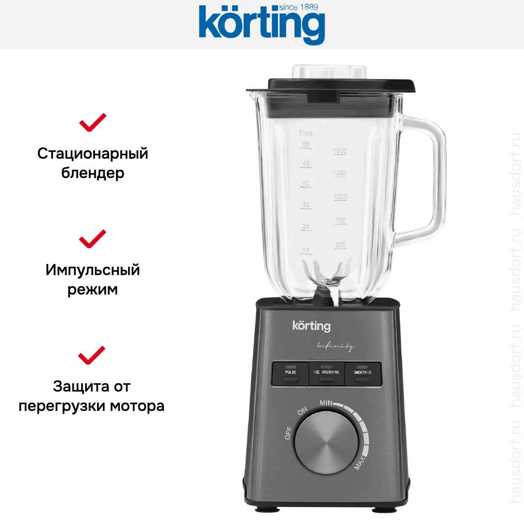 Блендер Korting KTB 0701 Infinity — мощная и надёжная стационарная модель, созданная для тех, кто требует профессионального подхода к приготовлению блюд в домашних условиях. Оснащённый 1500-ваттным двигателем, этот прибор легко справляется с самыми сложными задачами: измельчает лёд до состояния снежной крошки, превращает орехи в гладкую пасту, взбивает густые кремы, готовит однородные супы-пюре и даже замешивает тесто для выпечки. Высокая мощность обеспечивает мгновенный и равномерный результат без перегрева и остановок.