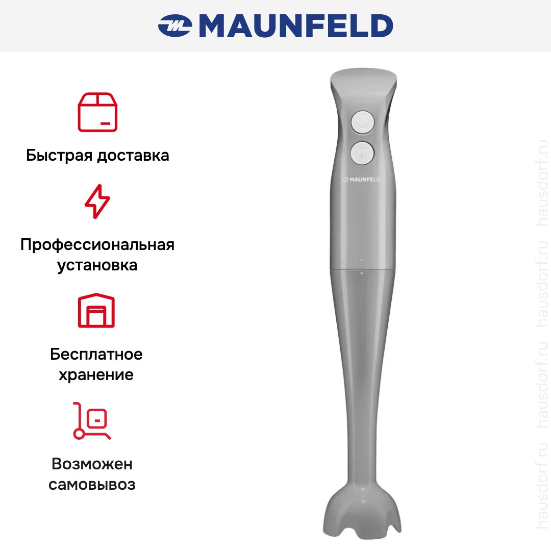 Погружной блендер Maunfeld позволяет готовить смузи, коктейли, смешивать соусы и заправки и многое другое. Такая конструкция требует вашего участия — нужно держать рукоятку с насадкой и контролировать направление движения. Плюс в том, что можно использовать ее прямо в кастрюле, когда готовите, например, суп-пюре. Корпус сделан в основном из пластика, что уменьшает вес прибора. Он может как влиться в общую гамму интерьера, так и стать ярким акцентом; доминирующий цвет — серый.