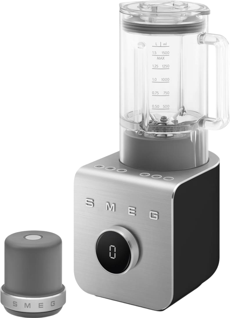 Стационарный блендер Smeg позволяет готовить смузи, коктейли, смешивать соусы и заправки, измельчать продукты до состояния пюре и многое другое. Его конструкция подразумевает автономную работу — вам нужно только положить овощи или фрукты и выбрать режим. Корпус сделан в основном из пластика, что уменьшает вес прибора. Он может как влиться в общую гамму интерьера, так и стать ярким акцентом; доминирующий цвет — черный. Благодаря специальным нескользящим ножкам блендер сохраняет устойчивость даже на высоких оборотах.