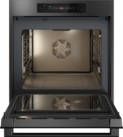 Особенности дизайна и внешней панели управления — также важный пункт при выборе духовки на кухню. В данной модели нужно обратить внимание на цвет — черная сталь, охлаждение двери, чтобы поверхность и мебель вокруг не нагревались.