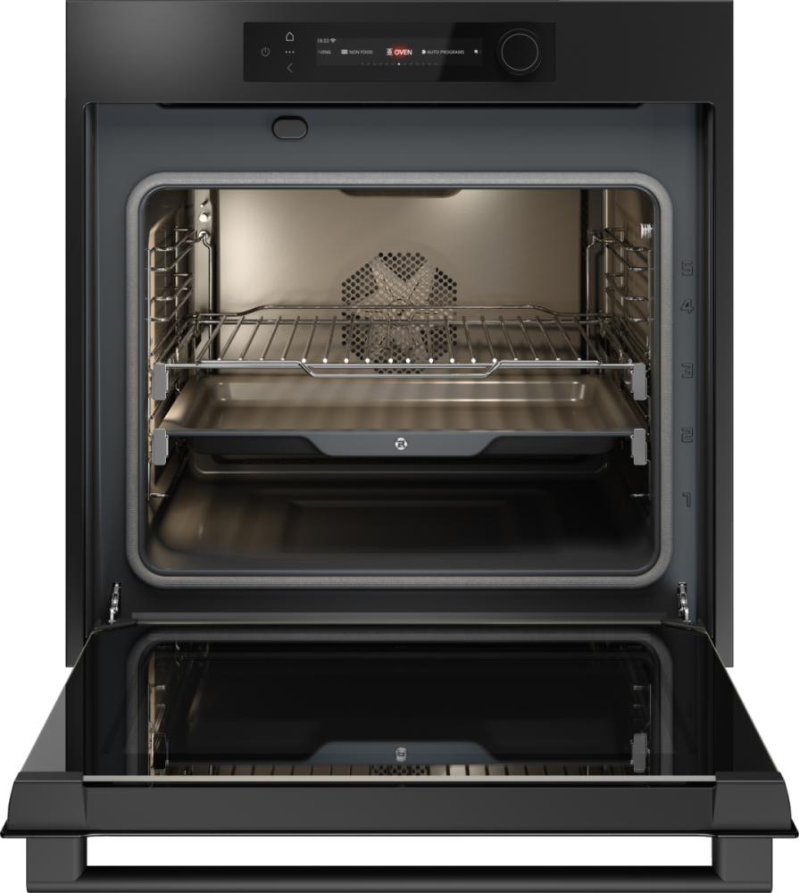 Особенности дизайна и внешней панели управления — также важный пункт при выборе духовки на кухню. В данной модели нужно обратить внимание на цвет — графит, охлаждение двери, чтобы поверхность и мебель вокруг не нагревались.