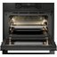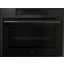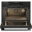 Откидная дверца представляет собой сплошную стеклянную поверхность без выступающих деталей, удобную в очистке. Трехслойное остекление и активное охлаждение препятствует нагреванию дверцы. И стекло, и дверцу можно снимать для упрощения очистки. Функция плавного закрывания и открывания Dual Soft Close позволяет плотно закрыть дверцу одним толчком. Камера изнутри покрыта пиролитической эмалью. Для освещения служат две галогенные лампы. Панель управления позволяет регулировать настройки при помощи поворотных переключателей, сенсорных кнопок и TFT-дисплея. Имеется возможность блокировки панели управления от детей. В комплект входят несколько противней из металла и стекла, набор для приготовления на пару, съемные направляющие.
