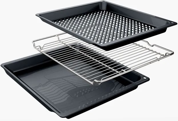 В стандартную комплектацию любого духового шкафа входят один или два противня — эмалированных или с антипригарным покрытием — и решетка. Единственный противень, как правило, имеет низкие бортики и предназначается для приготовления выпечки. Если духовка комплектуется двумя противнями, то второй отличается более высокими бортиками — его можно использовать для запекания мяса, птицы, овощных блюд. На решетке в духовке, не оснащенной грилем, обычно устанавливаются формы для запекания — стальные, керамические или стеклянные. В духовках премиум-класса количество противней может быть увеличено: к стандартному комплекту добавляются противни с перфорацией для мяса, специальные поддоны для сбора выделившегося сока.
