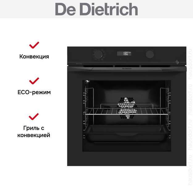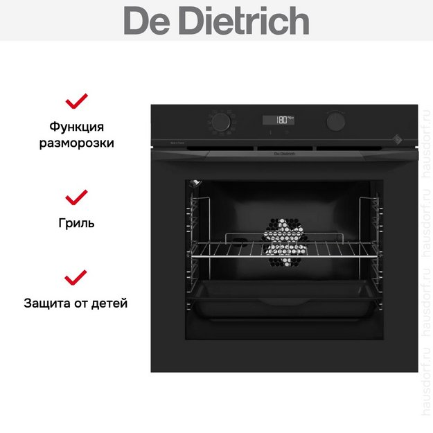 Количество режимов работы в духовом шкафу Де Дитрих: 10. В число доступных программ входят: классический нагрев, конвекция, гриль для создания хрустящей корочки, и другие. Помимо основных программ воспользуйтесь специальными возможностями этого прибора: размораживанием продуктов, чтобы сократить время на подготовку; опцией автоматического поднятия теста; и другими. Тип гриля в этой модели — электрический.