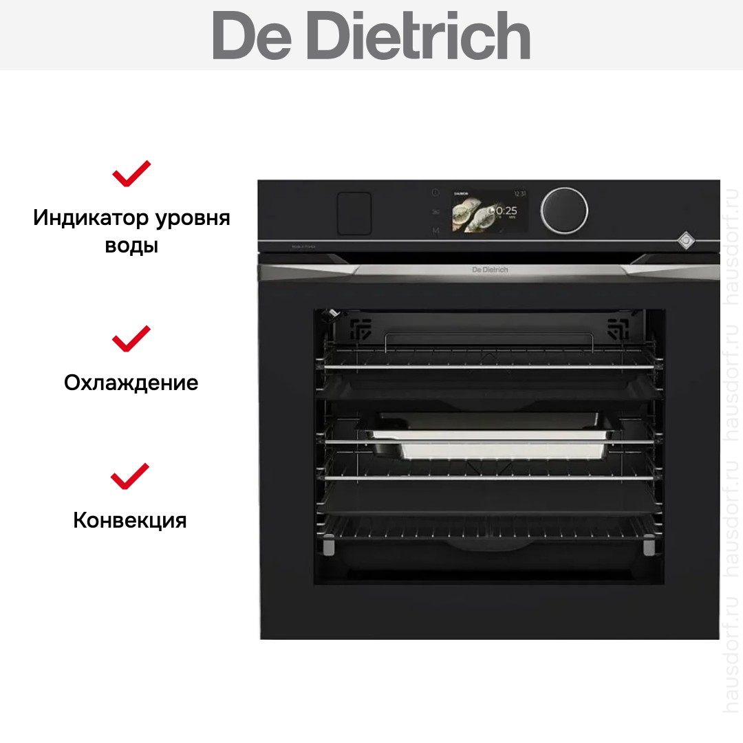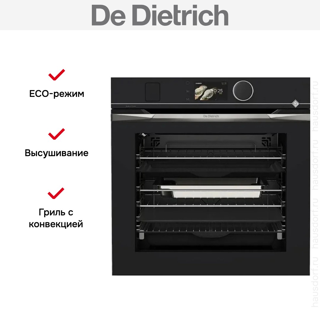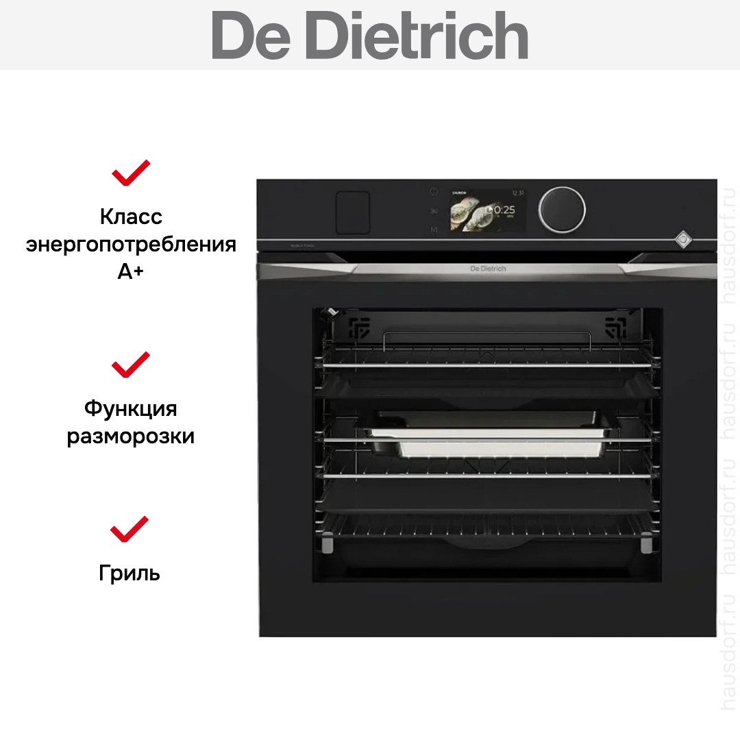 Духовой шкаф De Dietrich DOR4747X — элегантное сочетание современного стиля и профессиональных кулинарных возможностей для дома. Его оформление в черном цвете удачно вписывается в минималистичные и классические интерьеры. Для управления предусмотрены сенсорные кнопки, большой поворотный регулятор и цветной TFT-дисплей. Это обеспечивает простоту и наглядность при настройке параметров работы.
