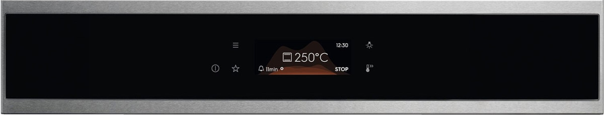 Гораздо нагляднее индикация в духовках с электронным управлением. На панели управления находится дисплей — текстовый или цифровой, на котором высвечиваются сообщения, оповещающие об активации той или иной опции. В более простых случаях духовки оснащаются сегментным ЖК-дисплеем, на который выводятся условные обозначения и числа. На нем может появляться, например, сообщение об уровне мощности гриля или микроволн, о выбранной температуре, о времени, оставшемся до отключения духовки, об запланированной отсрочке старта. TFT-дисплей имеет больший набор возможностей: на нем отображаются не только символы и цифры, но и полноценный текст, а также изображения.