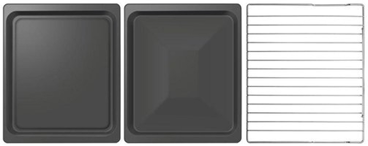 В стандартную комплектацию любого духового шкафа входят один или два противня — эмалированных или с антипригарным покрытием — и решетка. Единственный противень, как правило, имеет низкие бортики и предназначается для приготовления выпечки. Если духовка комплектуется двумя противнями, то второй отличается более высокими бортиками — его можно использовать для запекания мяса, птицы, овощных блюд. На решетке в духовке, не оснащенной грилем, обычно устанавливаются формы для запекания — стальные, керамические или стеклянные. В духовках премиум-класса количество противней может быть увеличено: к стандартному комплекту добавляются противни с перфорацией для мяса, специальные поддоны для сбора выделившегося сока.