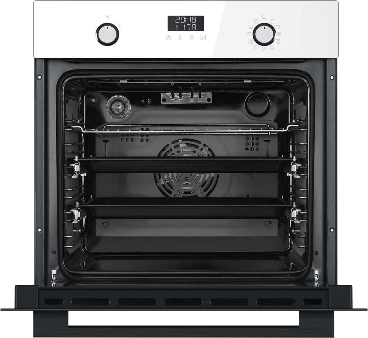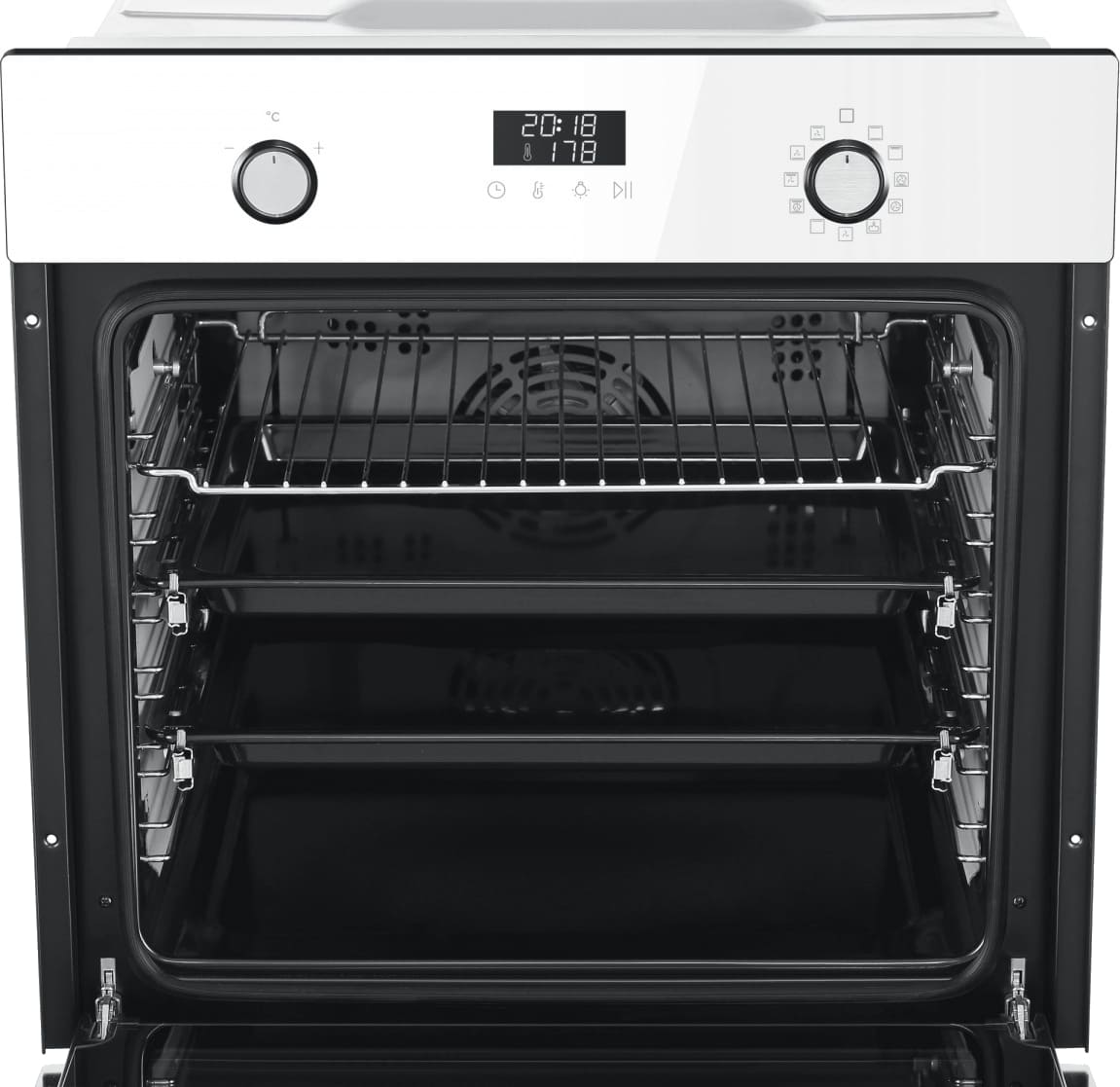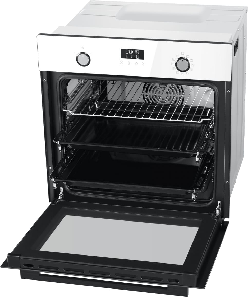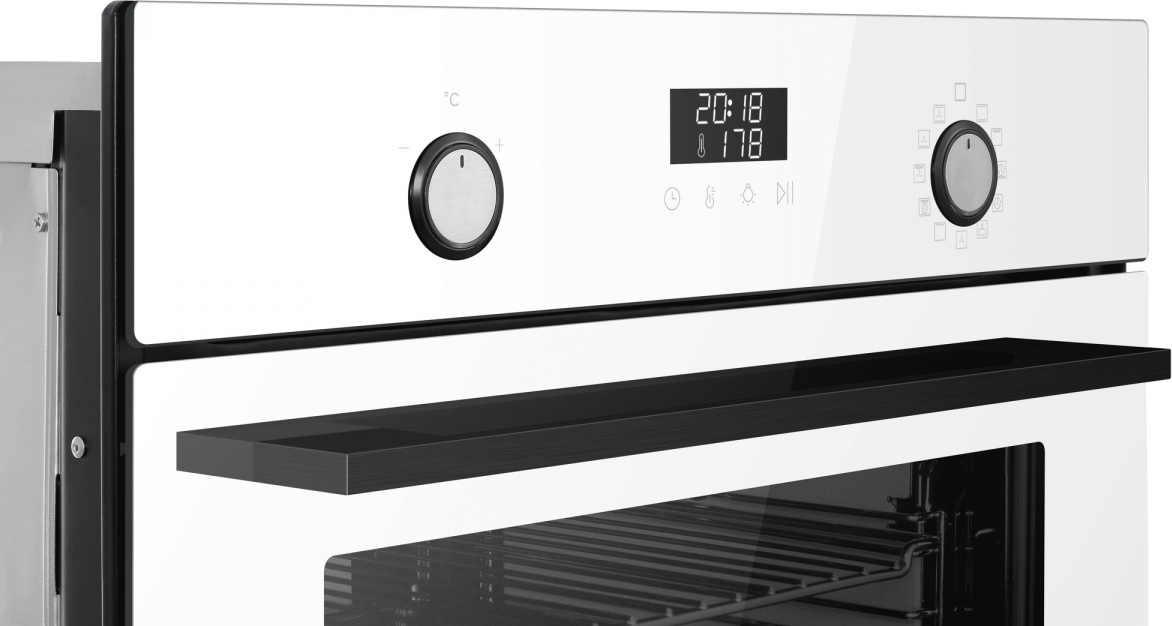 Особенности дизайна и внешней панели управления — также важный пункт при выборе духовки на кухню. В данной модели нужно обратить внимание на цвет — белый,