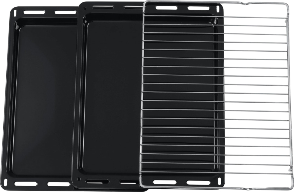 В стандартную комплектацию любого духового шкафа входят один или два противня — эмалированных или с антипригарным покрытием — и решетка. Единственный противень, как правило, имеет низкие бортики и предназначается для приготовления выпечки. Если духовка комплектуется двумя противнями, то второй отличается более высокими бортиками — его можно использовать для запекания мяса, птицы, овощных блюд. На решетке в духовке, не оснащенной грилем, обычно устанавливаются формы для запекания — стальные, керамические или стеклянные. В духовках премиум-класса количество противней может быть увеличено: к стандартному комплекту добавляются противни с перфорацией для мяса, специальные поддоны для сбора выделившегося сока.