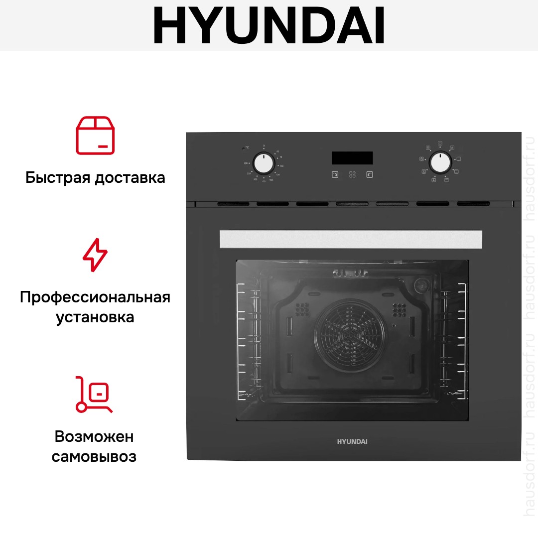 Духовой шкаф Hyundai HEO-66411-BG выполнен в чёрном цвете с серебристыми акцентами и лаконичным фасадом, который органично смотрится в любой современной кухне. Его компактные габариты 59.5×59.5×56.5 см позволяют встраивать аппарат в стандартную нишу 60×56×43 см, а аккуратная откидная дверца с двумя стеклами и серебристой фурнитурой подчёркивают аккуратный внешний вид. Утапливаемые поворотные регуляторы и сенсорные кнопки сохраняют чистые линии панели и уменьшают риск случайного срабатывания. Цифровой дисплей с индикацией текущего времени добавляет информативности и точности управления.