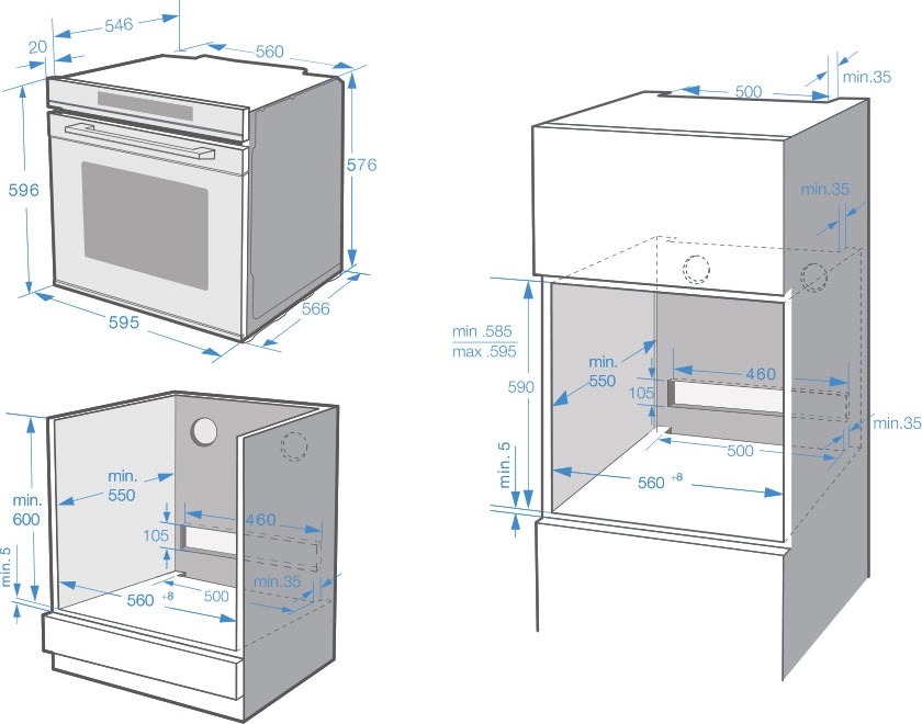 Размеры ниши для встраивания духового шкафа определяются, исходя из габаритов самого устройства. Стандартные модели обычно без труда устанавливаются в нишу шириной около 560 мм, высотой около 595 мм и глубиной примерно 550 мм. Следует помнить, что фасад устройства должен иметь большие размеры, чем величина ниши.