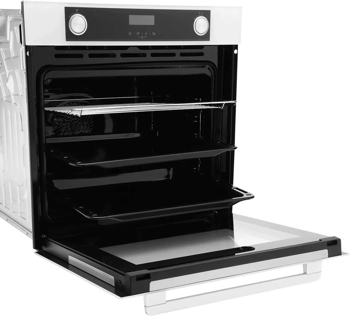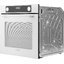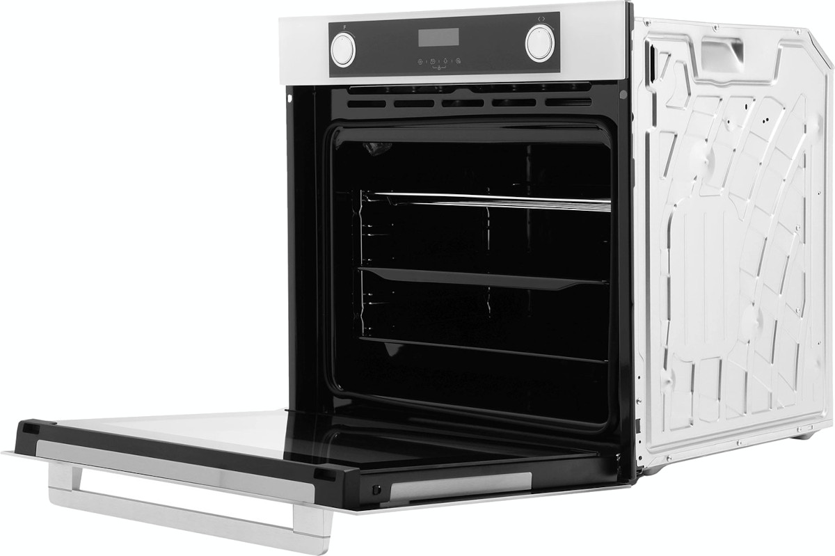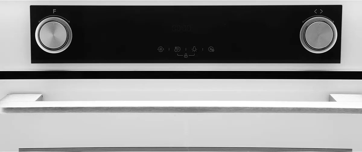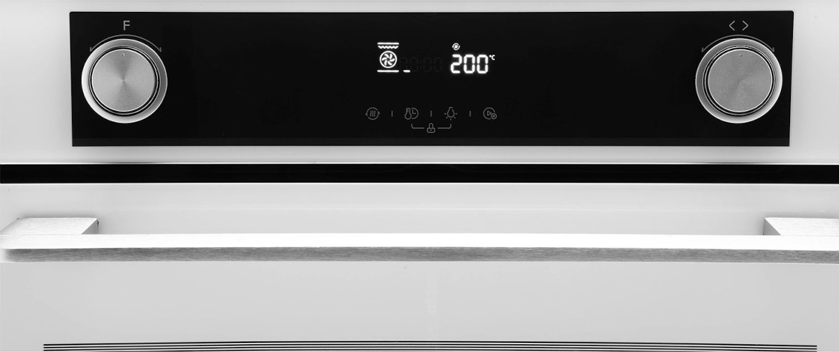 Особенности дизайна и внешней панели управления — также важный пункт при выборе духовки на кухню. В данной модели нужно обратить внимание на цвет — белый, охлаждение двери, чтобы поверхность и мебель вокруг не нагревались.
