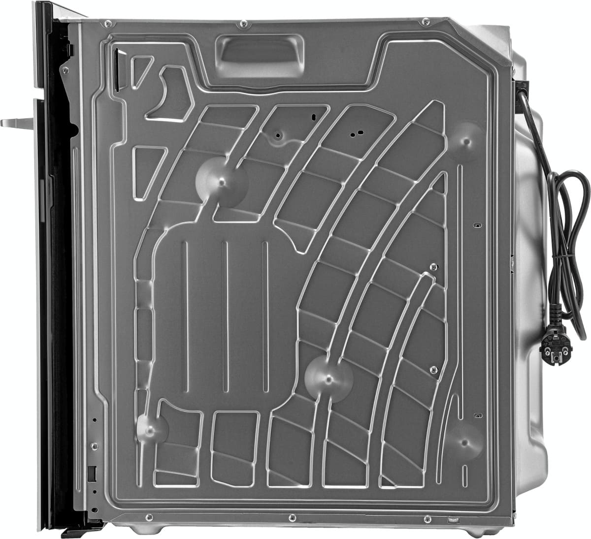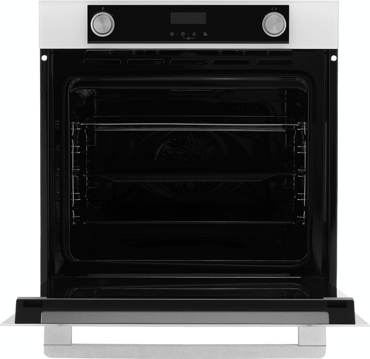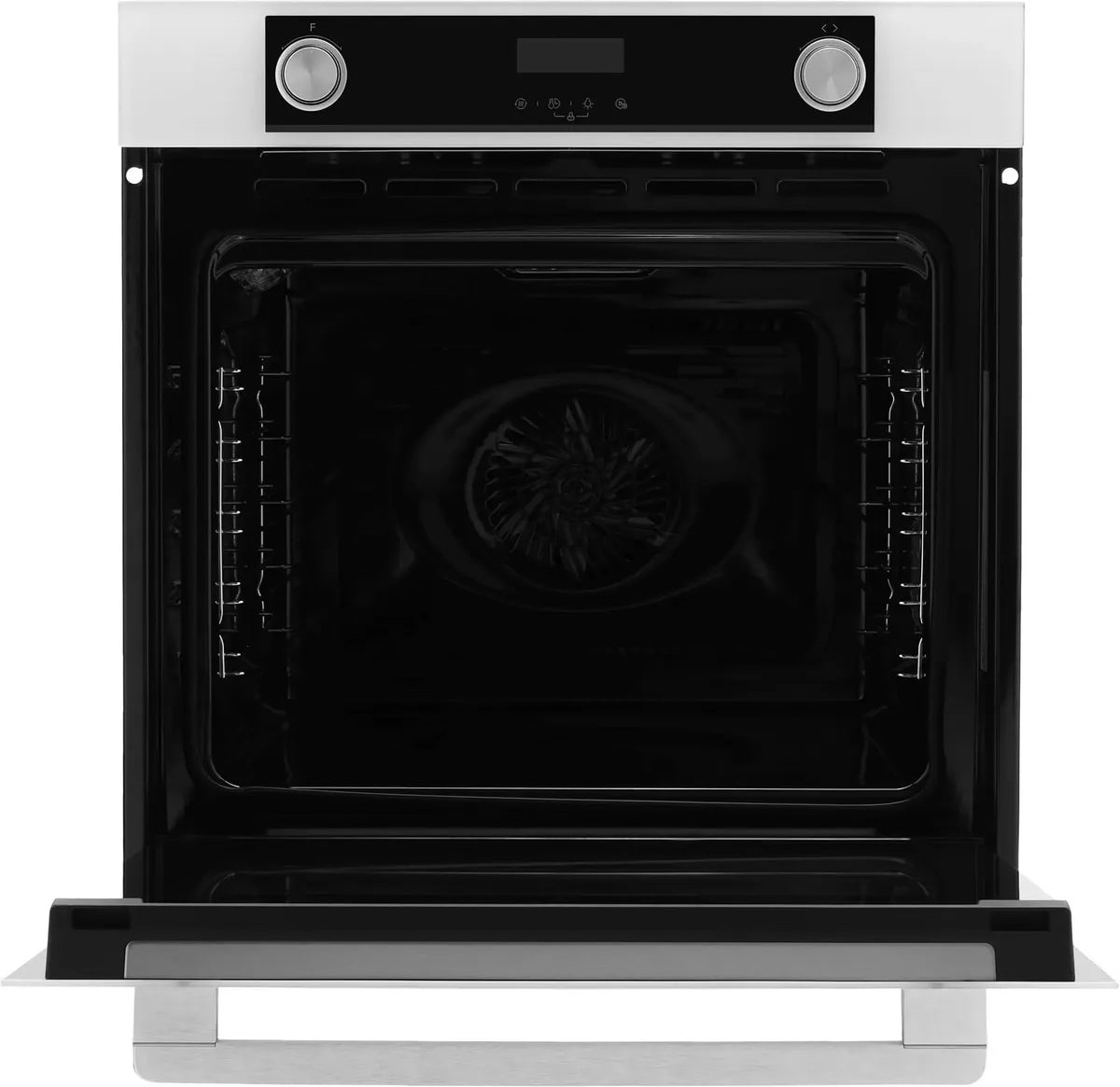 Особенности дизайна и внешней панели управления — также важный пункт при выборе духовки на кухню. В данной модели нужно обратить внимание на цвет — белый, охлаждение двери, чтобы поверхность и мебель вокруг не нагревались.