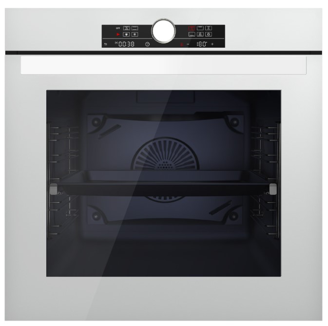Особенности дизайна и внешней панели управления — также важный пункт при выборе духовки на кухню. В данной модели нужно обратить внимание на цвет — белое стекло,