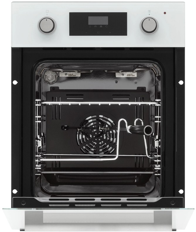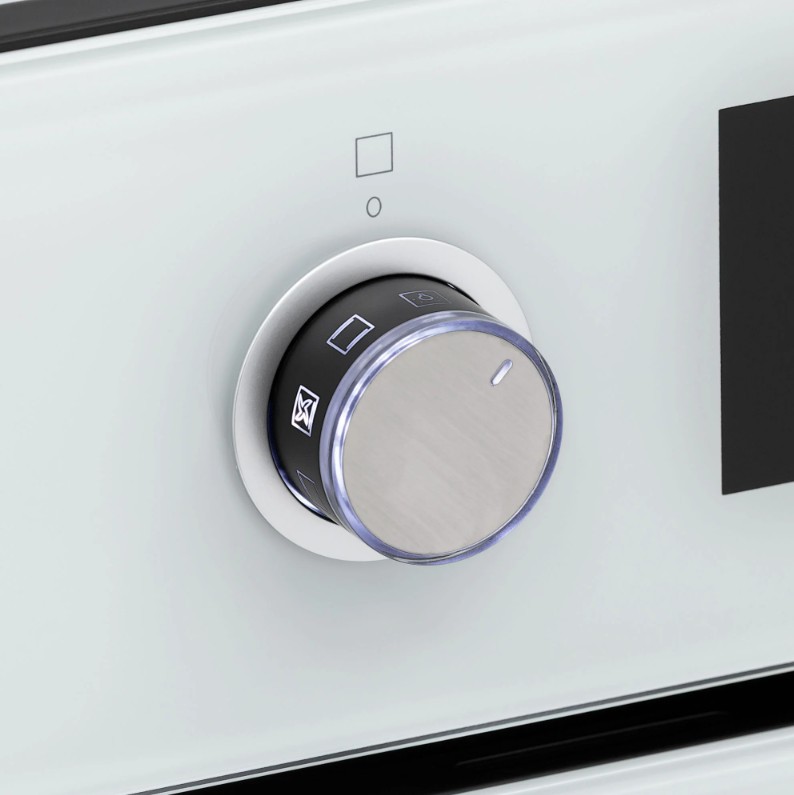 Особенности дизайна и внешней панели управления — также важный пункт при выборе духовки на кухню. В данной модели нужно обратить внимание на цвет — белый, охлаждение двери, чтобы поверхность и мебель вокруг не нагревались.