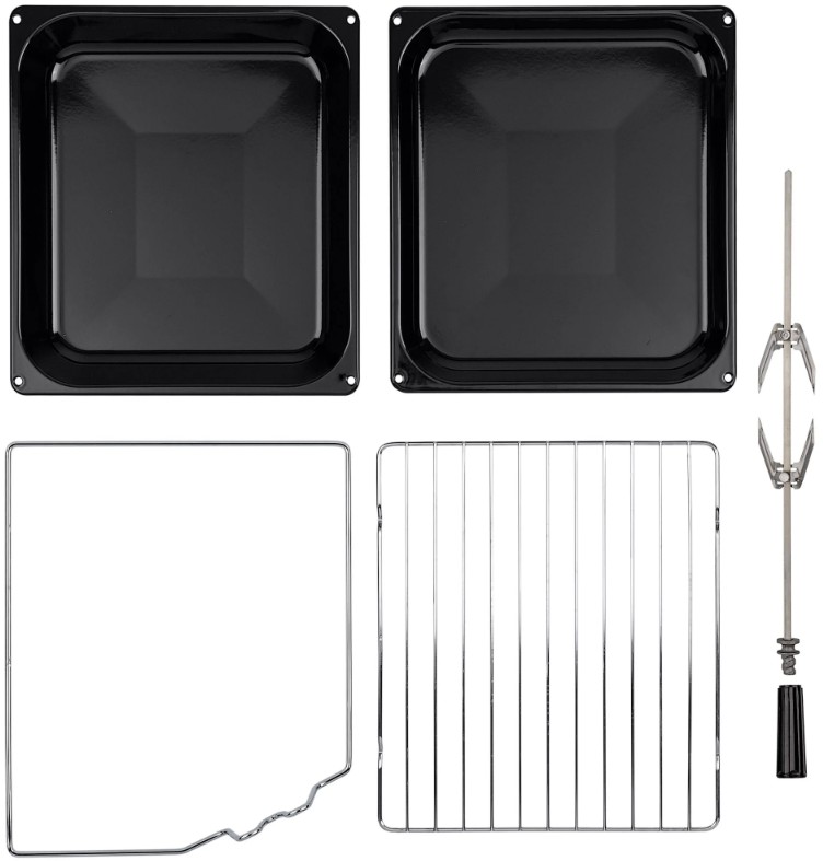 В стандартную комплектацию любого духового шкафа входят один или два противня — эмалированных или с антипригарным покрытием — и решетка. Единственный противень, как правило, имеет низкие бортики и предназначается для приготовления выпечки. Если духовка комплектуется двумя противнями, то второй отличается более высокими бортиками — его можно использовать для запекания мяса, птицы, овощных блюд. На решетке в духовке, не оснащенной грилем, обычно устанавливаются формы для запекания — стальные, керамические или стеклянные. В духовках премиум-класса количество противней может быть увеличено: к стандартному комплекту добавляются противни с перфорацией для мяса, специальные поддоны для сбора выделившегося сока.