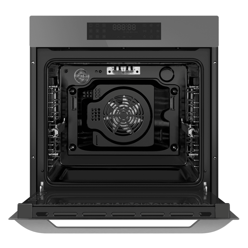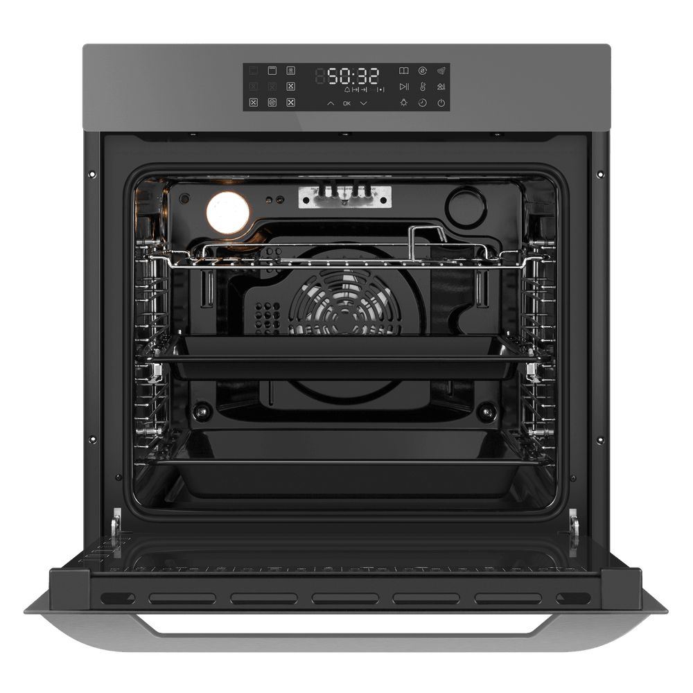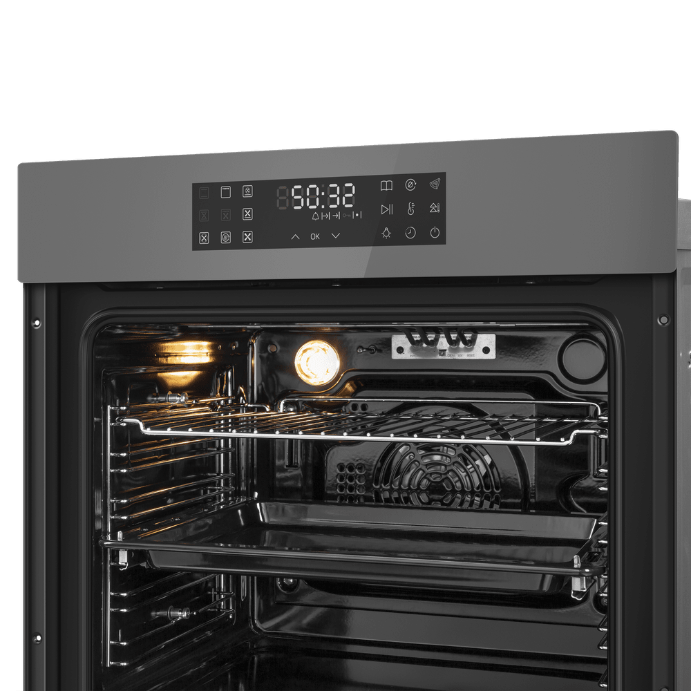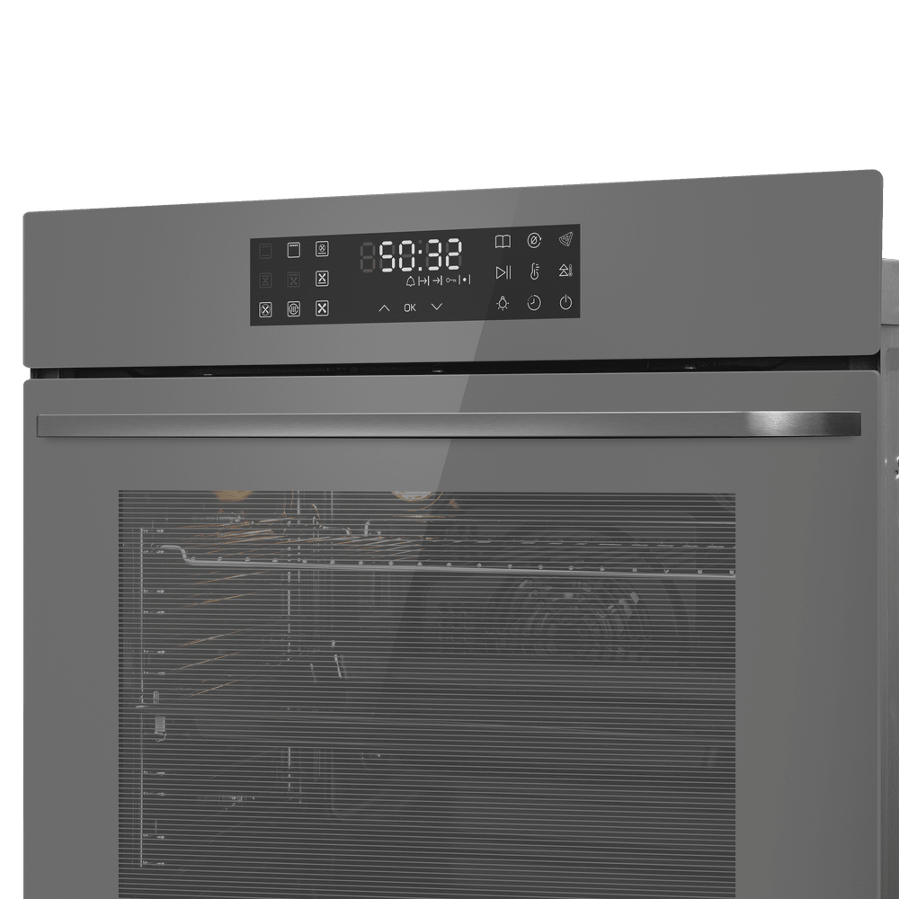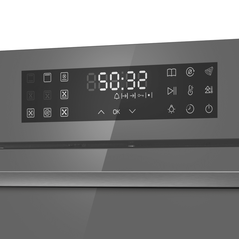 Особенности дизайна и внешней панели управления — также важный пункт при выборе духовки на кухню. В данной модели нужно обратить внимание на цвет — серый, охлаждение двери, чтобы поверхность и мебель вокруг не нагревались.