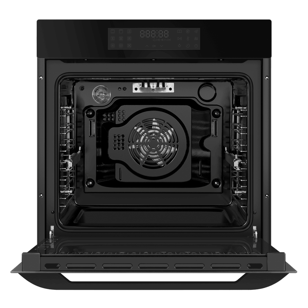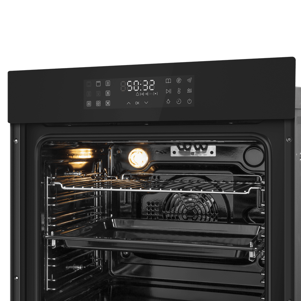 Особенности дизайна и внешней панели управления — также важный пункт при выборе духовки на кухню. В данной модели нужно обратить внимание на цвет — черный, охлаждение двери, чтобы поверхность и мебель вокруг не нагревались.