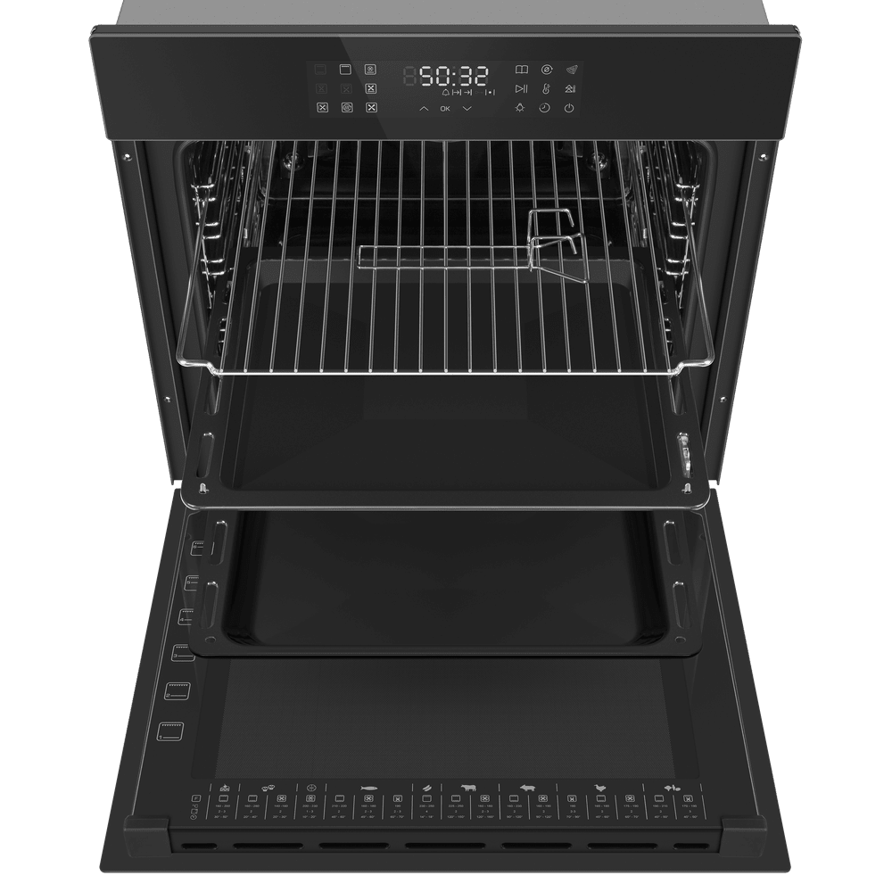 Духовые шкафы объема от 70 литров и более — вместительные полноразмерные приборы, которые отличаются большим набором функциональных возможностей. Высота таких духовок обычно составляет 60 см, ширина же может варьироваться в широком диапазоне: от стандартных 60 см до 90 см и даже 120 см. Количество уровней приготовления может достигать пяти.