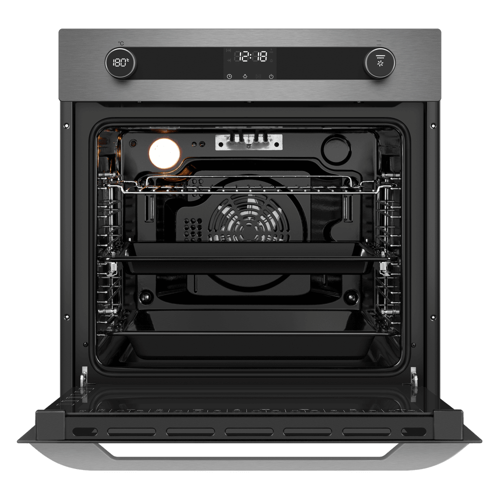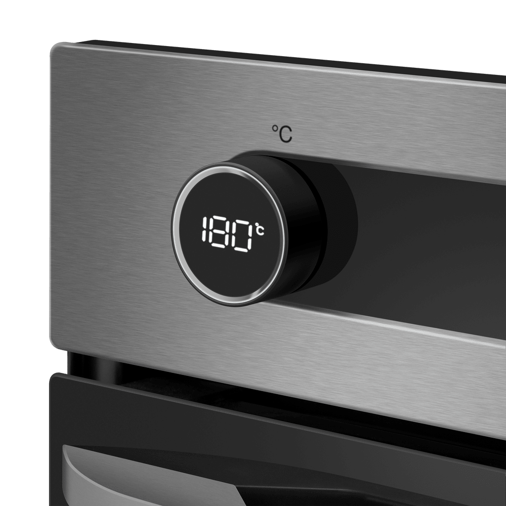 Особенности дизайна и внешней панели управления — также важный пункт при выборе духовки на кухню. В данной модели нужно обратить внимание на цвет — нержавеющая сталь,