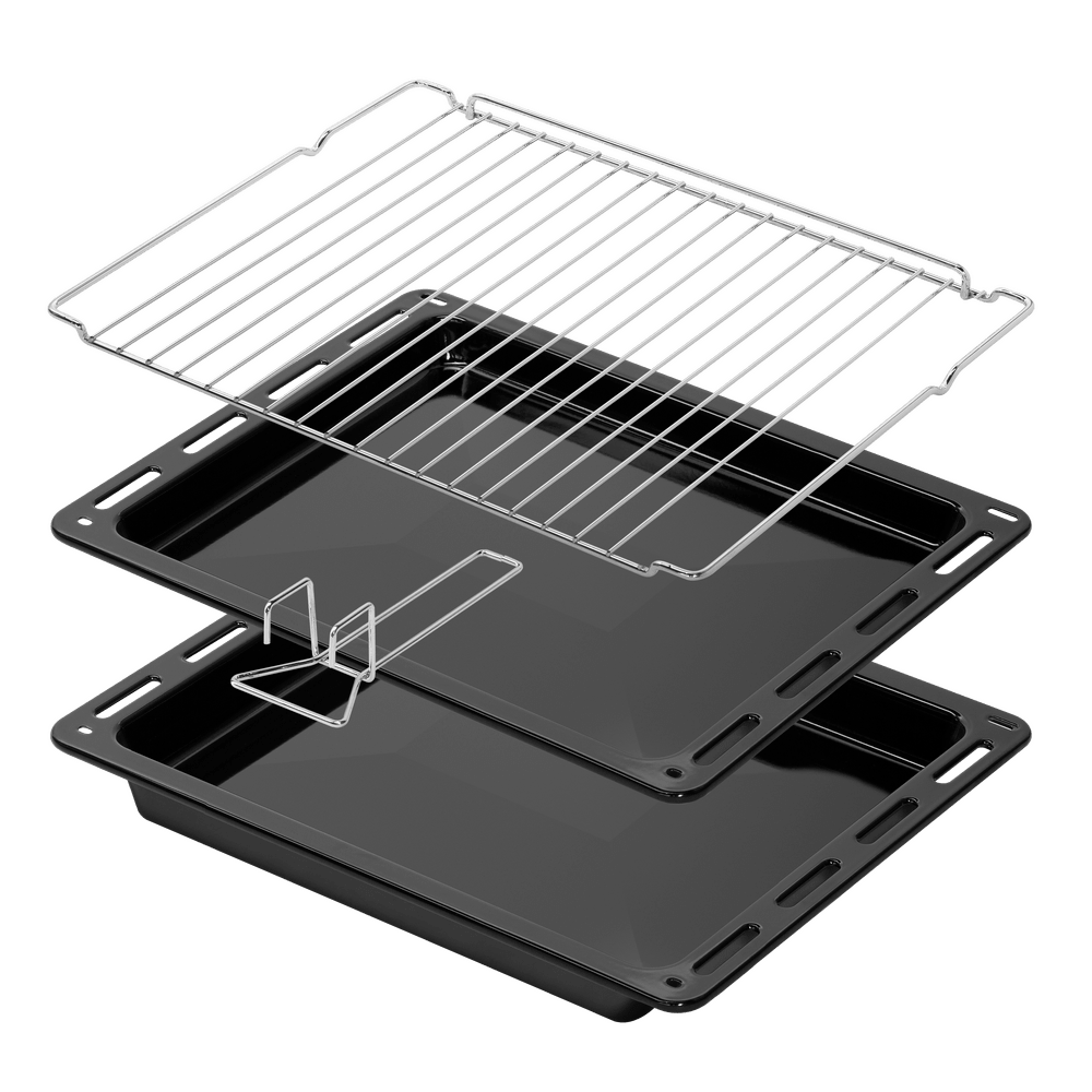В стандартную комплектацию любого духового шкафа входят один или два противня — эмалированных или с антипригарным покрытием — и решетка. Единственный противень, как правило, имеет низкие бортики и предназначается для приготовления выпечки. Если духовка комплектуется двумя противнями, то второй отличается более высокими бортиками — его можно использовать для запекания мяса, птицы, овощных блюд. На решетке в духовке, не оснащенной грилем, обычно устанавливаются формы для запекания — стальные, керамические или стеклянные. В духовках премиум-класса количество противней может быть увеличено: к стандартному комплекту добавляются противни с перфорацией для мяса, специальные поддоны для сбора выделившегося сока.