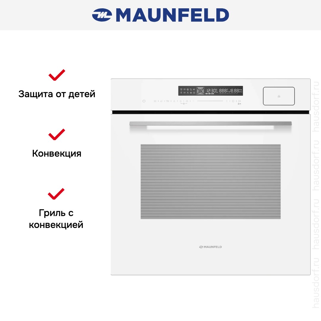 Количество режимов работы в духовом шкафу Маунфилд: 16. В число доступных программ входят: классический нагрев, нижний нагрев, конвекция, гриль для создания хрустящей корочки, и другие. Тип гриля в этой модели — электрический.
