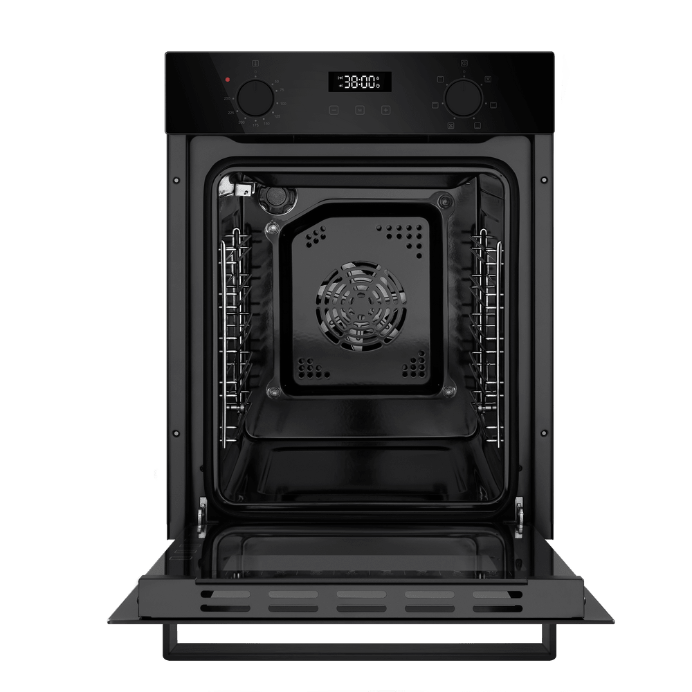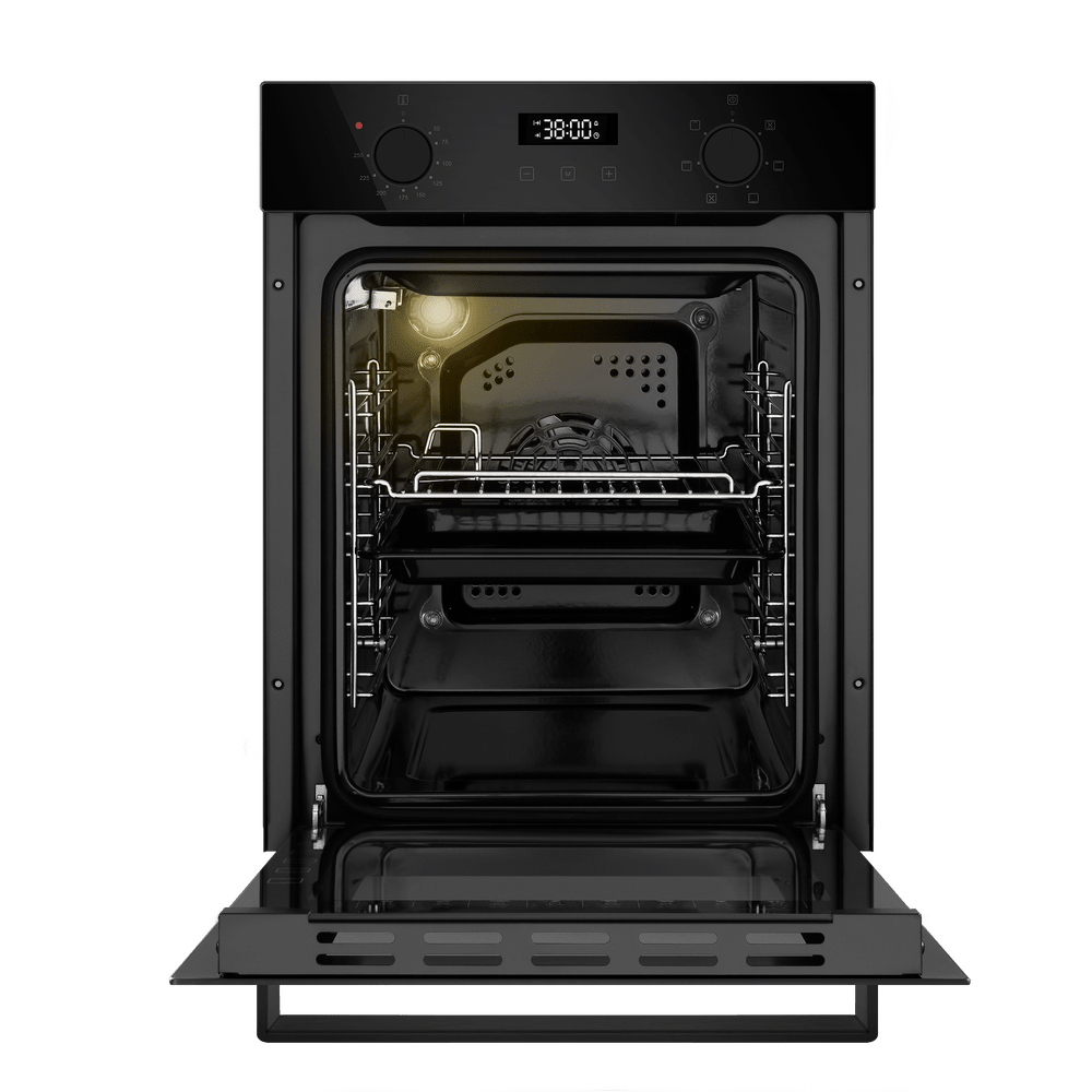 Как известно, стандартная ширина кухонной тумбы составляет около 60 см — поэтому за стандартную ширину встраиваемого духового шкафа принимают 59,5 см. Такие духовки имеют по 3–4 уровня приготовления, в них можно приготовить достаточно объемные блюда. Минимальное значение ширины духовки также соотносится с размерами тумбы для встраивания — оно составляет 44–45 см. Это хороший выбор для небольшой кухни, однако узкие духовые шкафы имеют свои недостатки — в частности, в них невозможно приготовить большой пирог или торт, запечь целый окорок, индейку или большую рыбу.