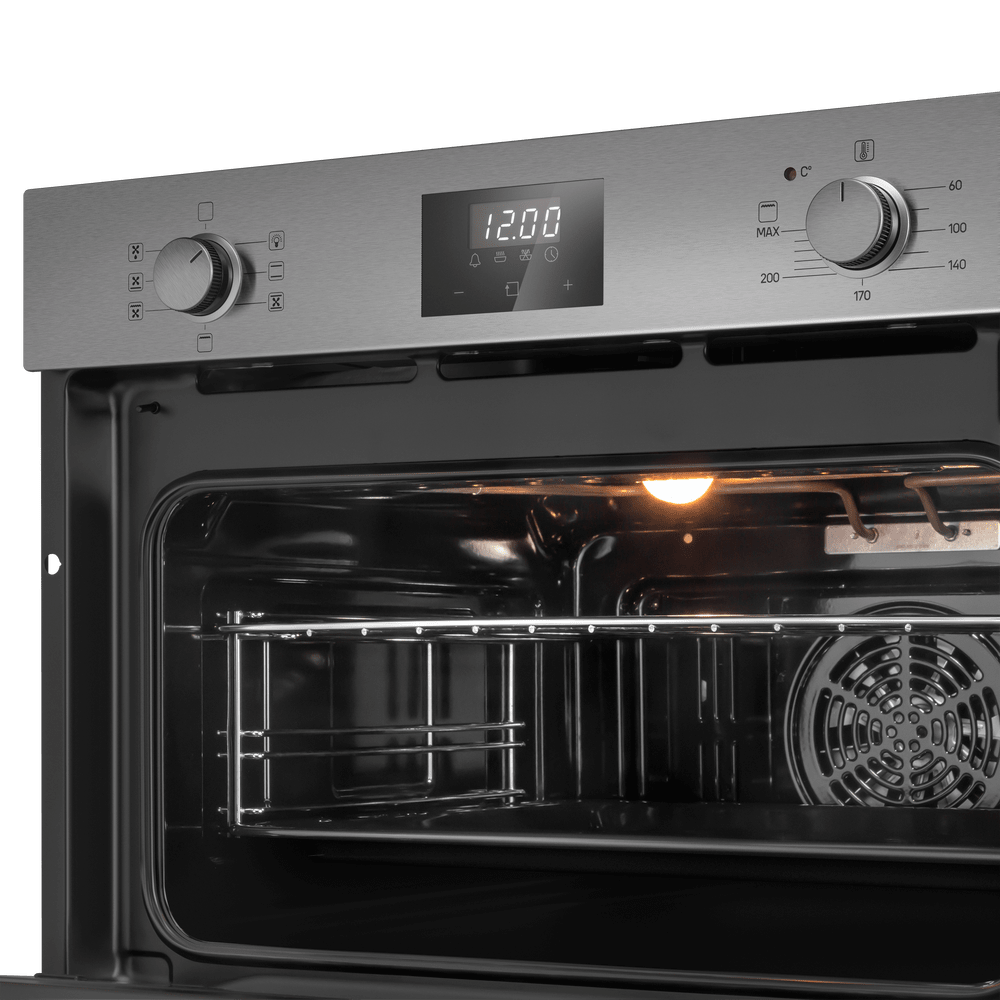 Особенности дизайна и внешней панели управления — также важный пункт при выборе духовки на кухню. В данной модели нужно обратить внимание на цвет — нержавеющая сталь, охлаждение двери, чтобы поверхность и мебель вокруг не нагревались.