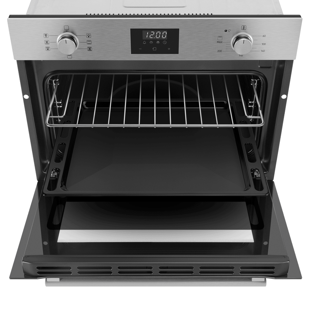 Как известно, стандартная ширина кухонной тумбы составляет около 60 см — поэтому за стандартную ширину встраиваемого духового шкафа принимают 59,5 см. Такие духовки имеют по 3–4 уровня приготовления, в них можно приготовить достаточно объемные блюда. Минимальное значение ширины духовки также соотносится с размерами тумбы для встраивания — оно составляет 44–45 см. Это хороший выбор для небольшой кухни, однако узкие духовые шкафы имеют свои недостатки — в частности, в них невозможно приготовить большой пирог или торт, запечь целый окорок, индейку или большую рыбу.