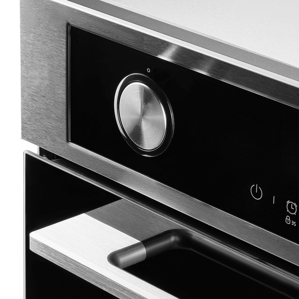 Особенности дизайна и внешней панели управления — также важный пункт при выборе духовки на кухню. В данной модели нужно обратить внимание на цвет — нержавеющая сталь,