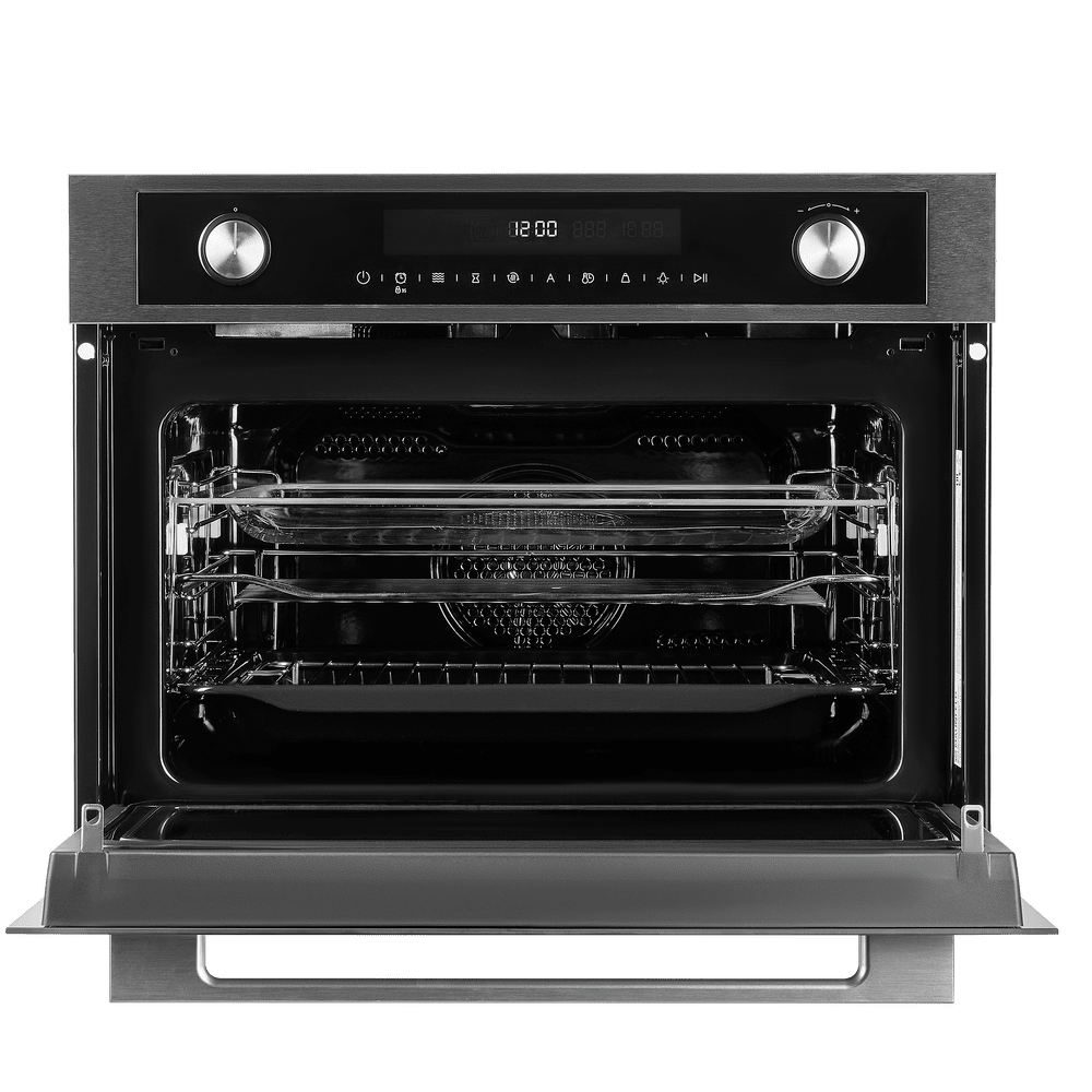 Компактные духовки — оптимальный выбор для тех, кто хочет питаться вкусно и разнообразно, но не располагает кухней большой площади. Подобные модели подойдут также для небольших семей или для тех, кто привык готовить достаточно редко. Объем рабочей камеры у компактных моделей не превышает 55 литров. Ширина их остается стандартной — около 60 см, высота составляет обычно 45 см, а энергопотребление и мощность несколько меньше, чем у полноразмерных моделей. Компактные духовки имеют до трех уровней приготовления.