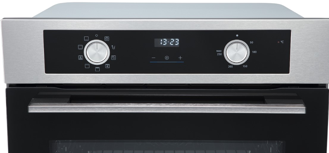 Особенности дизайна и внешней панели управления — также важный пункт при выборе духовки на кухню. В данной модели нужно обратить внимание на цвет — нержавеющая сталь,