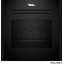 Выглядит как встроенный электрический прибор черного цвета с лаконичной передней панелью Flex Design и откидной дверцей, оснащённой доводчиком. Сенсорные кнопки и TFT-дисплей создают гладкую поверхность управления, часы — электронные, отображение настроек понятное. Корпус рассчитан на встраивание в нишу размеров 58.5-59.5 × 56-56.8 × 55 см, габариты самой печи 59.5×59.6×54.8 см.