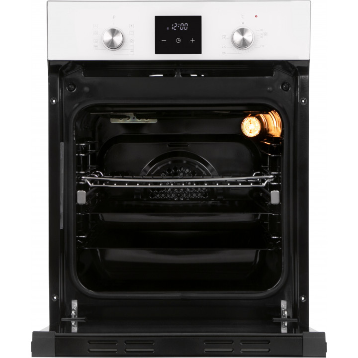 Особенности дизайна и внешней панели управления — также важный пункт при выборе духовки на кухню. В данной модели нужно обратить внимание на цвет — белый,