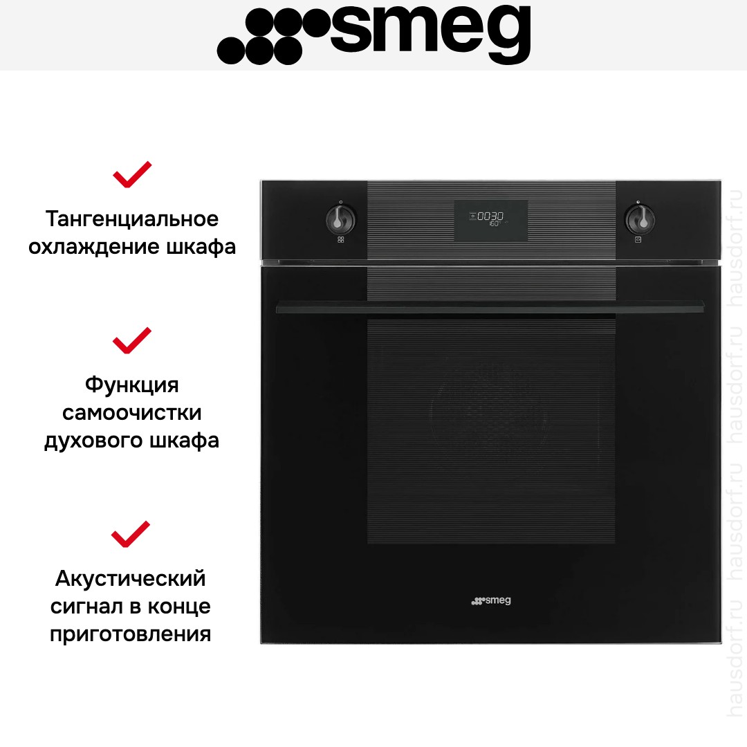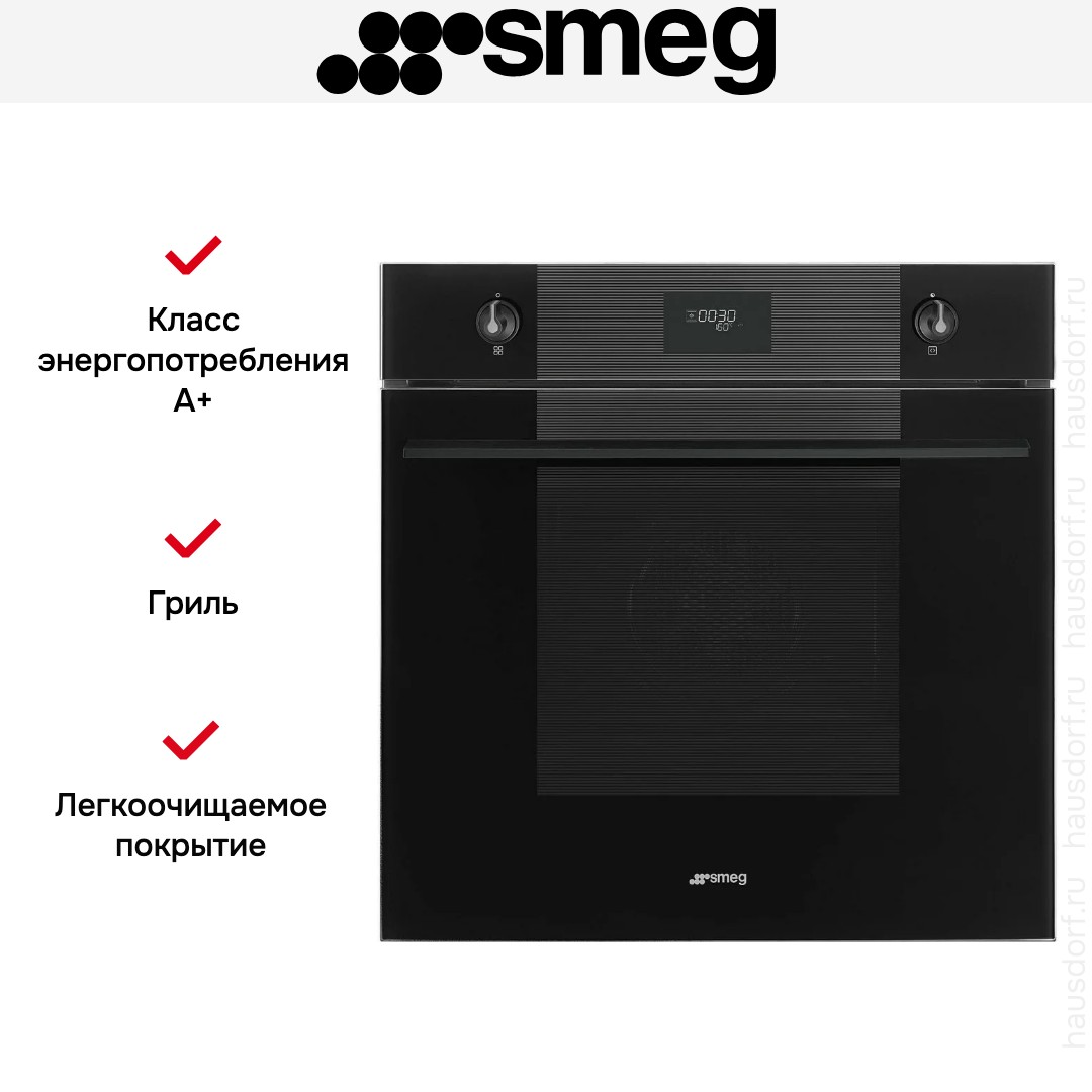 Духовой шкаф Smeg SFP61TB3FR — независимая электрическая модель в строгом черном исполнении, созданная для встраивания в стандартную нишу 60 см. Его габариты 59.2×59.7×57.1 см обеспечивают плотную и аккуратную посадку. Для монтажа подойдет ниша размером 58.3—58.5×55.4—56.4×56 см, что упрощает замену техники без переделки мебели. Черная фурнитура и матовая панель придают кухне единый, современный образ.