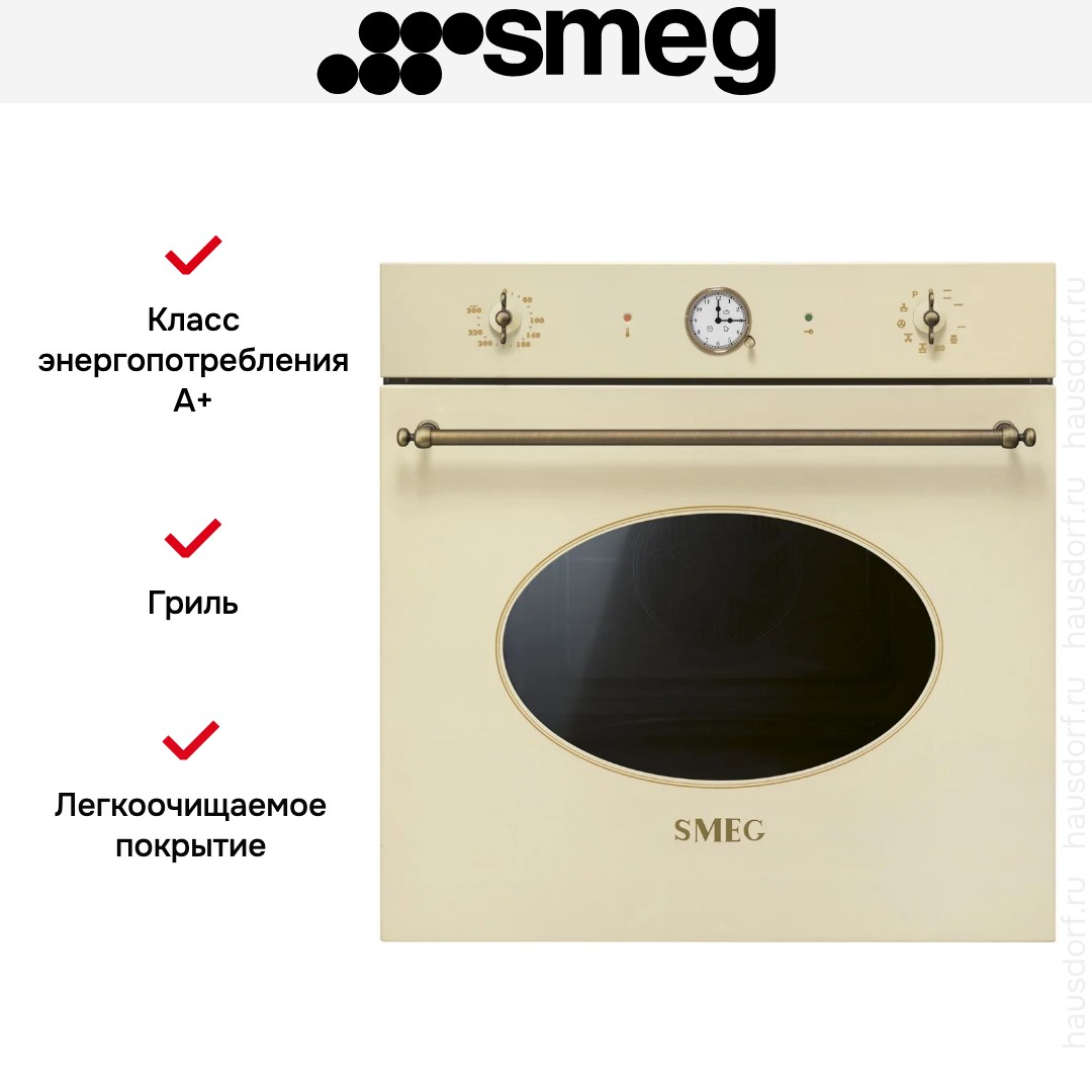 Духовой шкаф Smeg SFP68C1TPO выполнен в приглушённом кремовом оттенке с латунной фурнитурой, что придаёт кухне уютную винтажную нотку и одновременно выглядит дорого. Такие материалы и цветовая гамма легко впишутся в классический или прованс-интерьер, а аккуратные поворотные регуляторы подчёркивают ретро-стиль при высокой эргономике.