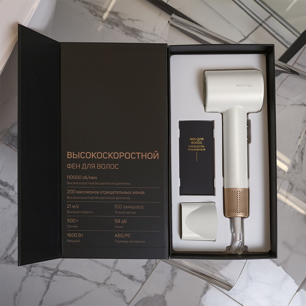 Белый фен Meyvel — стильное решение для дома, гостиниц и отелей. Мощность 1600 Вт, два температурных режима (55 °C и 85 °C), функция холодного обдува и ионизация обеспечивают бережную и эффективную сушку всех типов волос. Устройство оснащено микротермическим датчиком защиты от перегрева, съемной магнитной насадкой и фильтром из нержавеющей стали. Уровень шума — менее 60 дБ.