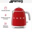 Чайник Smeg KLF05RDEU относится к коллекции в стиле ретро, воспроизводящей дизайн бытовой техники 50-х годов 20 века. Эта компактная модель высотой 20 см и весом 1 кг привлекает ярко-красным глянцевым корпусом с отделкой из полированной стали и хрома. Корпус обтекаемой формы с плотно прилегающей крышкой изготовлен из термопластичного полимера — безопасного, не выделяющего вредных веществ и выдерживающего температуру до 180 градусов. Внутри пластикового корпуса находится колба из нержавеющей стали. Из стали выполнены также носик и установленный в нем сетчатый фильтр для защиты от попадания накипи в чашку.
