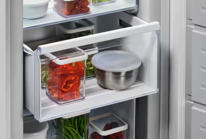 Ящики для продуктов изготавливаются либо целиком из прозрачного пластика, либо часто имеют переднюю прозрачную панель, которая обеспечивает лучший обзор. Полки в большинстве холодильников могут перемещаться по высоте, устанавливаются на специальных направляющих и без труда снимаются для очистки.