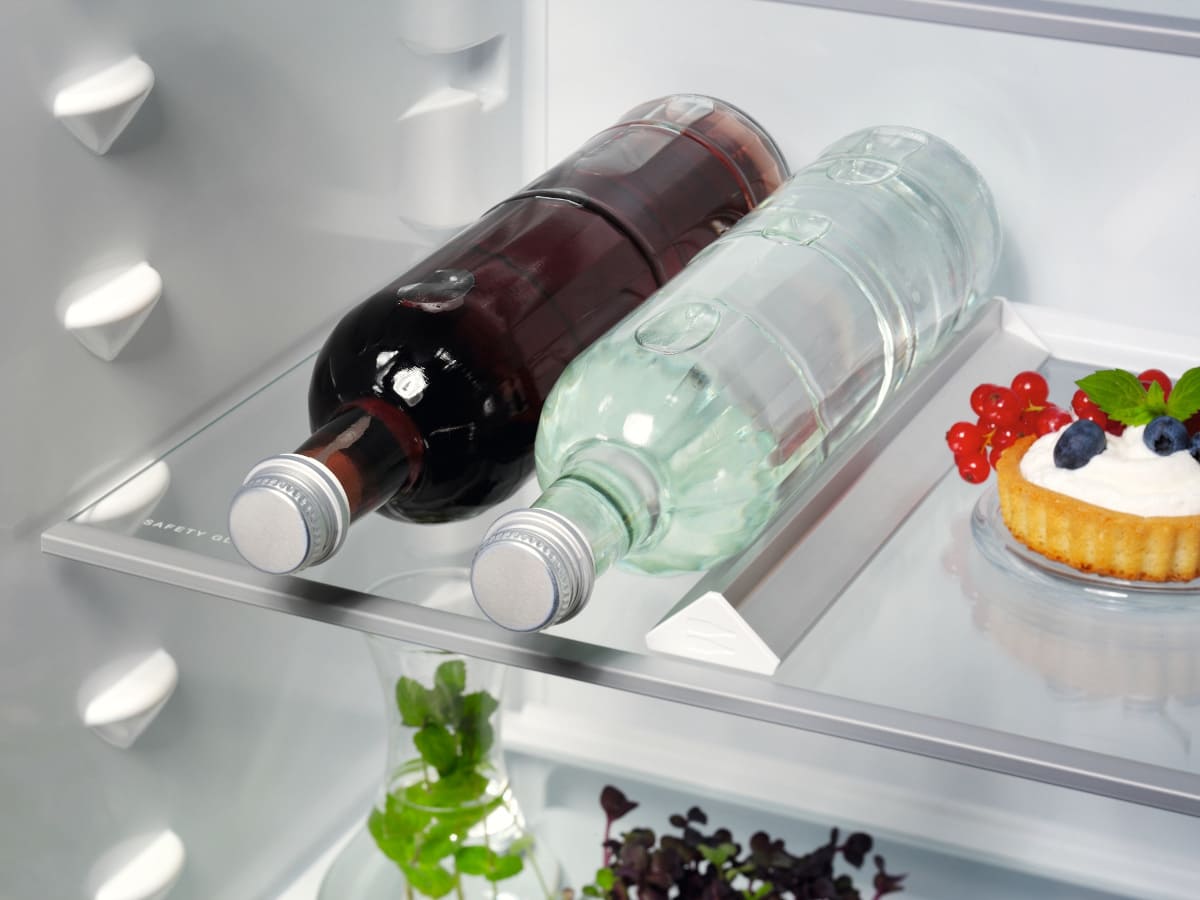 Регулируемые полки в холодильнике позволяют эффективно организовать хранение продуктов и облегчают их поиск в камере. Как правило, полки в холодильной камере изготавливаются из закаленного стекла, способного выдерживать большие нагрузки. Стекло является наиболее безопасным, прочным, нейтральным материалом, благодаря его прозрачности на полках можно легко отыскать любые продукты, а специальный бортик предохраняет устройство от протекания.