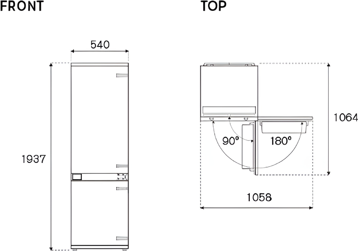 Высота корпуса составляет 193,7 см при ширине 54 см и глубине 55 см, что делает устройство идеальным для кухонь с высокими гарнитурами. Оно легко устанавливается в нишу с габаритами от 193,4 до 194,2 см по высоте, 56 см по ширине и 56 см в глубину, гарантируя плотное прилегание, надёжную вентиляцию и свободное открывание дверей. Благодаря полностью встраиваемому исполнению, техника полностью скрывается за фасадами мебели, сохраняя гармонию дизайна и подчёркивая минималистичную эстетику пространства.