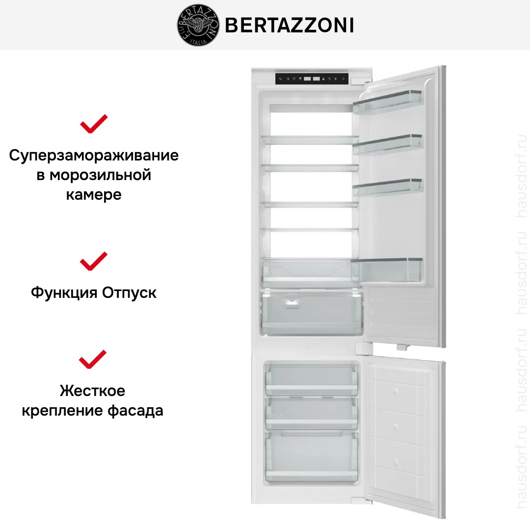 Встраиваемый холодильник Bertazzoni REF604BBNPTC — элегантное и вместительное решение для современной кухни, сочетающее итальянское качество, продуманную эргономику и безупречную интеграцию в интерьер. Модель представляет собой двухкамерный агрегат с нижним размещением морозильного отделения — рациональная конфигурация, при которой наиболее часто используемые продукты хранятся на уровне глаз, обеспечивая удобный доступ без необходимости наклоняться.