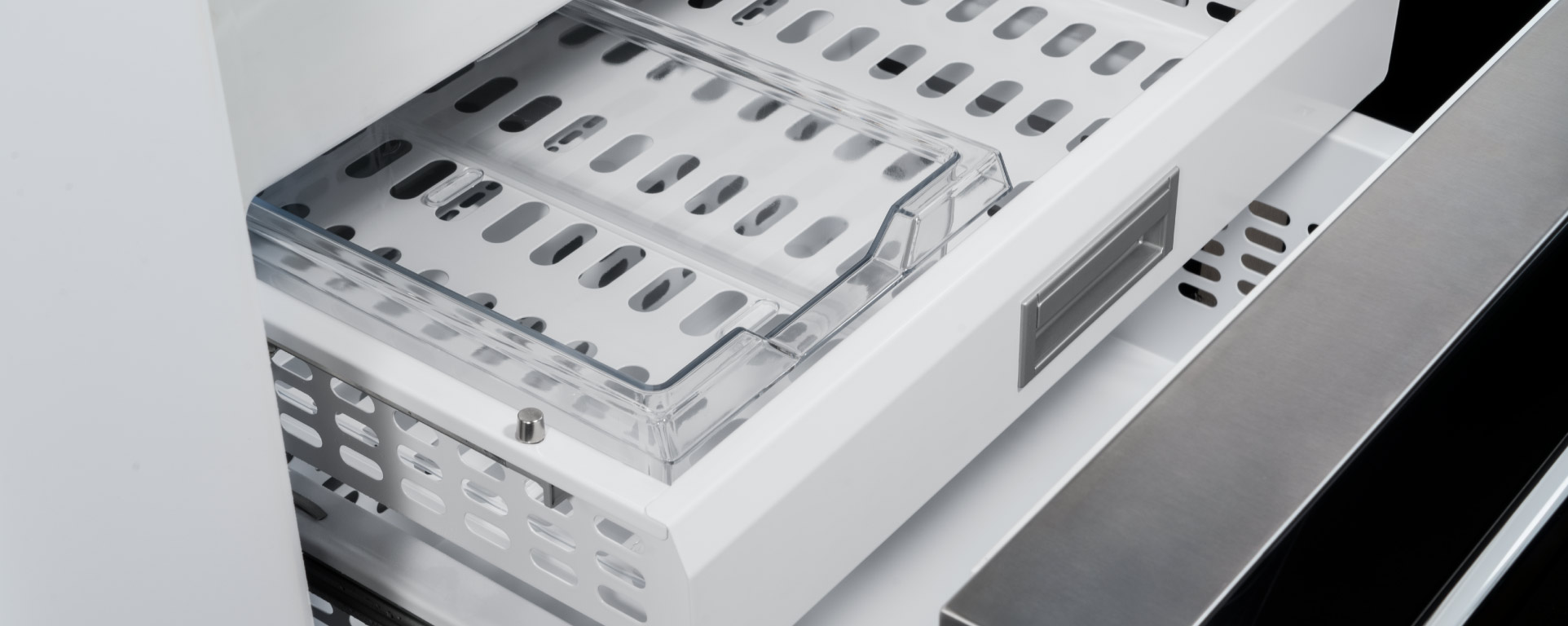 Очень редко в холодильниках можно увидеть откидную дверцу — она имеется, например, в отсеке для вакуумирования в холодильниках Hitachi.