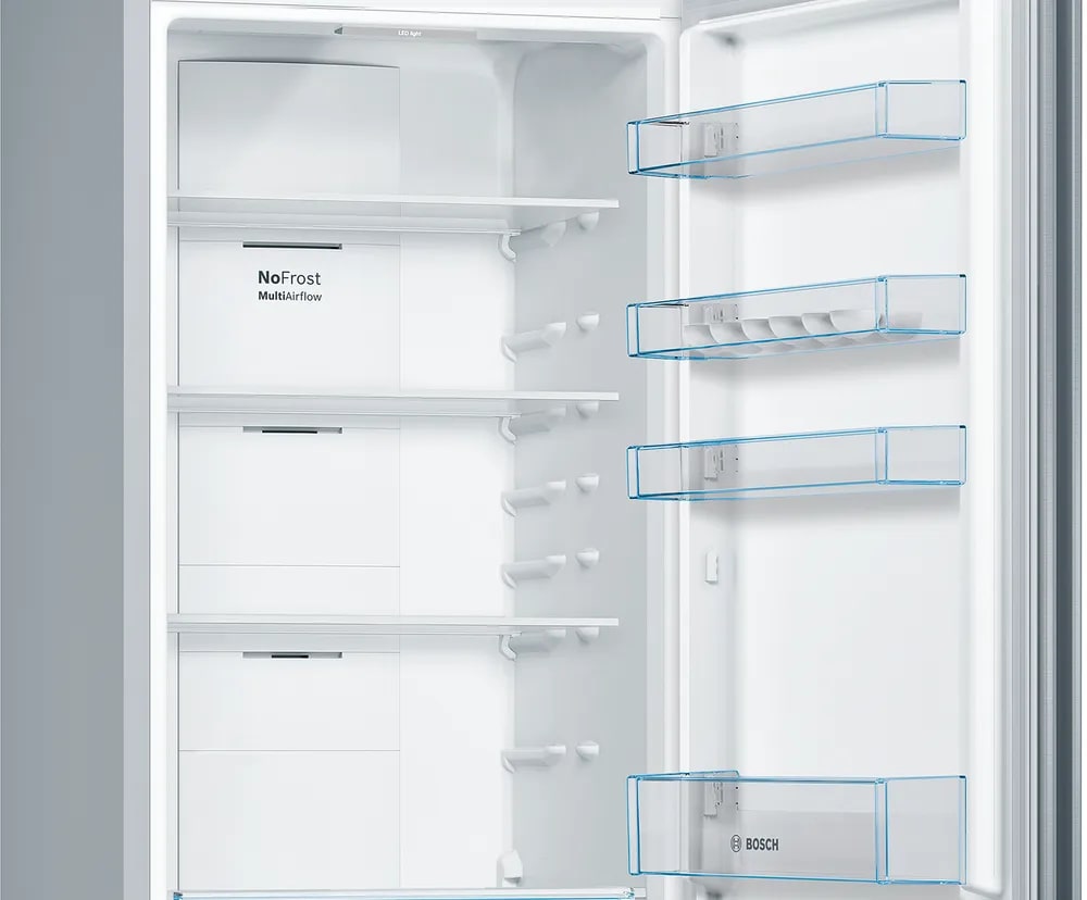 Холодильник Bosch KGN39UL30U — отдельно стоящий агрегат высотой 203 см с нижней морозильной камерой. Корпус из нержавеющей стали придаёт ему сдержанную элегантность, прочность и надёжность. Встроенные вертикальные ручки сохраняют чистые линии фасада. Правый дверной упор установлен по умолчанию, но возможна перевешивание дверей для удобства расположения техники на кухне.